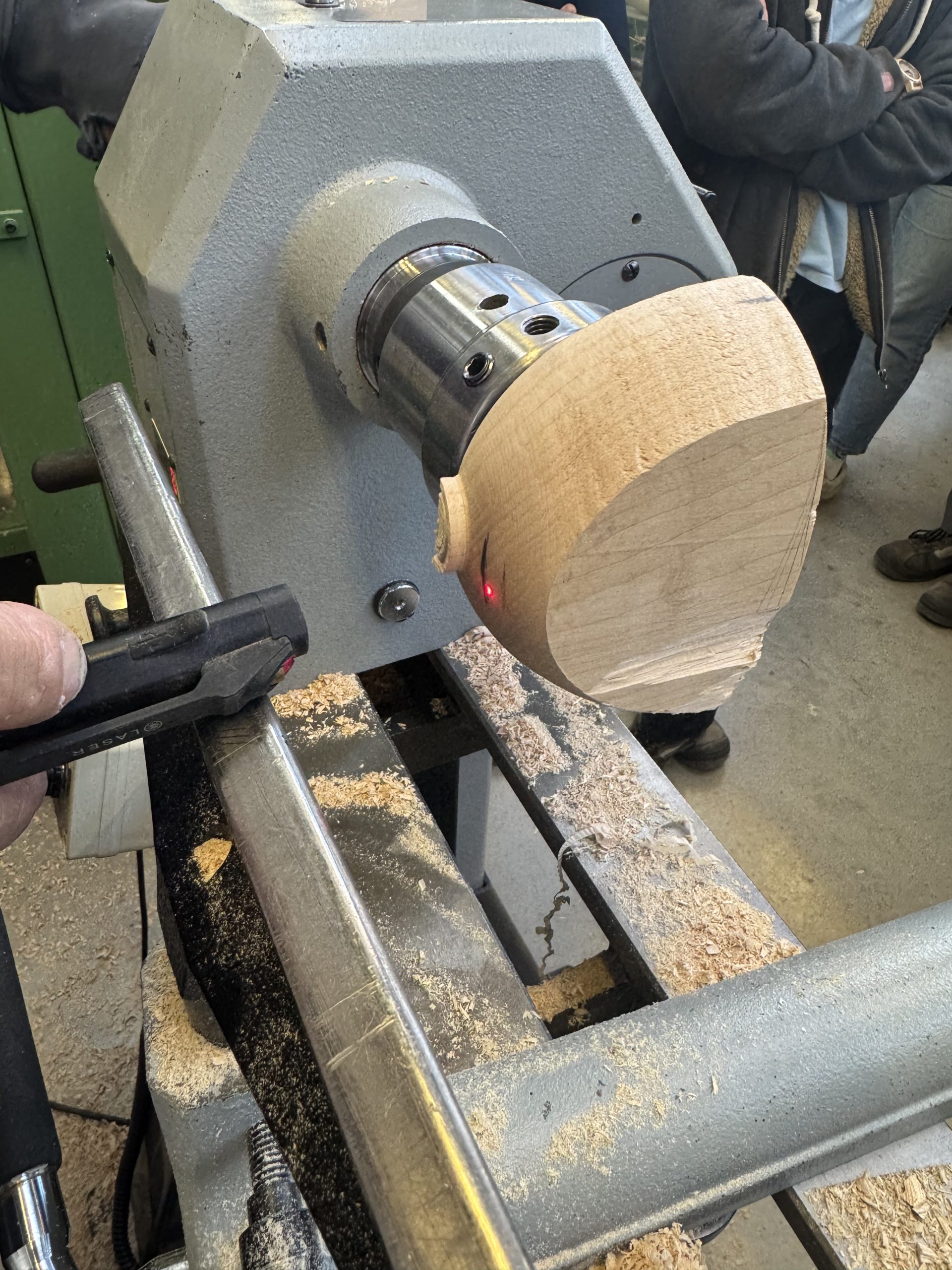 Dans cet atelier, les démonstrations faites aux élèves sont nombreuses.  Hubert qui a soigneusement préparer ses débits et collages en bois d’érable réalise une démonstration sur le tour à bois pour présenter la manière d’ébaucher le corps d’une théière. Les éléments qui composent celle-ci sont tournés, rapportés par collage, puis texturés.